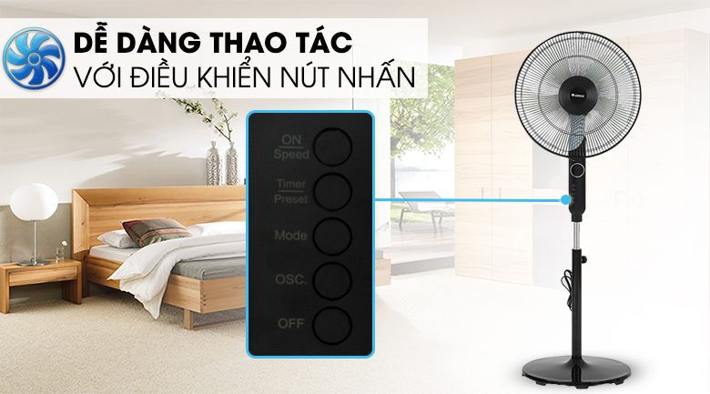 Điều khiển bằng nút nhấn, có các chỉ dẫn rõ ràng, dễ thao tác, có 4 mức độ gió từ nhẹ đến mạnh, 3 chế độ gió thường, gió tự nhiên và gió ngủ êm ái