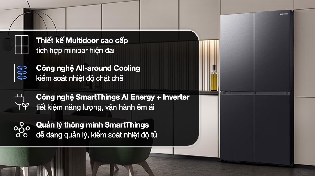 - Công nghệ Inverter có khả năng điều chỉnh máy nén hoạt động giúp duy trì nhiệt độ ổn định bên trong tủ nhưng vẫn mang lại hiệu quả tiết kiệm điện, đồng thời còn giúp tủ lạnh hoạt động êm ái. - Công nghệ SmartThings AI Energy cung cấp giải pháp trong ứng dụng SmartThings, cho phép người dùng theo dõi và tối ưu hóa điện năng tiêu thụ hàng tháng. Xem thêm: Chứng nhận công nghệ trên tủ lạnh Samsung